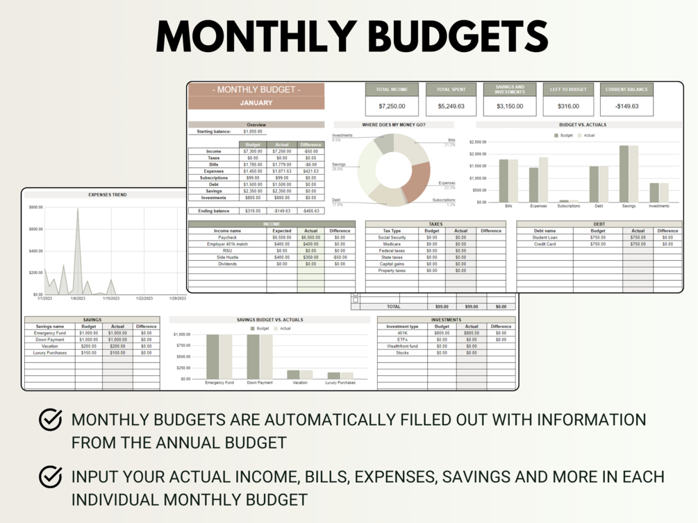 2. Monthly Budget Management: Each of the 12 monthly tabs allows you to detail your income, expenses, and savings for the month. Track your actual spending against your budgeted amounts to stay on top of your finances.