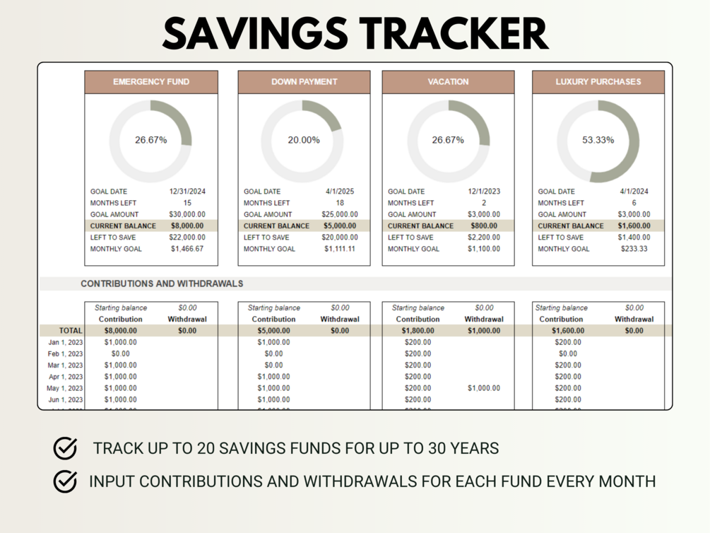 4. Savings Tracker: Set savings goals and monitor your progress with our intuitive savings tracker. Whether it’s for an emergency fund, a vacation, or a large purchase, this tab helps you stay motivated and on target.