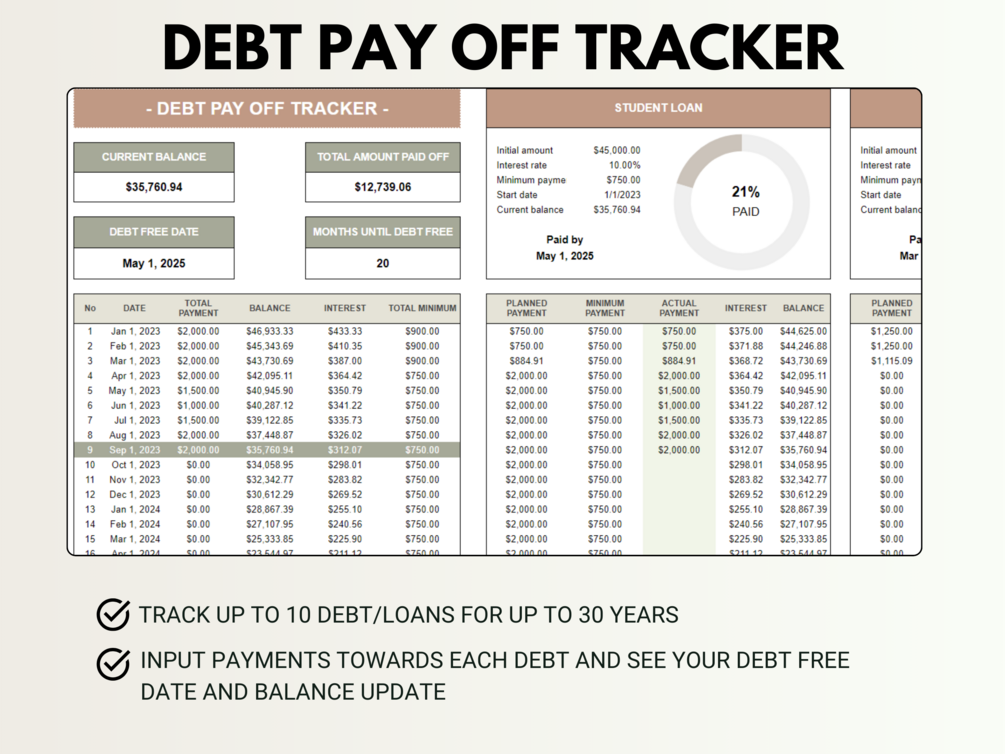 5. Debt Payoff Tracker: Manage your debt repayment with ease. Input your debts, choose your repayment strategy, track your monthly payments, and visualize your progress as you work towards becoming debt-free.