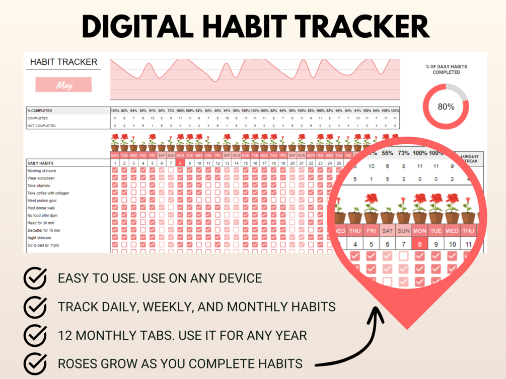 Start by listing the habits you want to build and setting your daily, weekly, and monthly goals. Use the tracker to log your progress, and watch as the roses grow with each completed habit. The automated dashboard provides visual feedback on your progress, helping you stay motivated and on track.