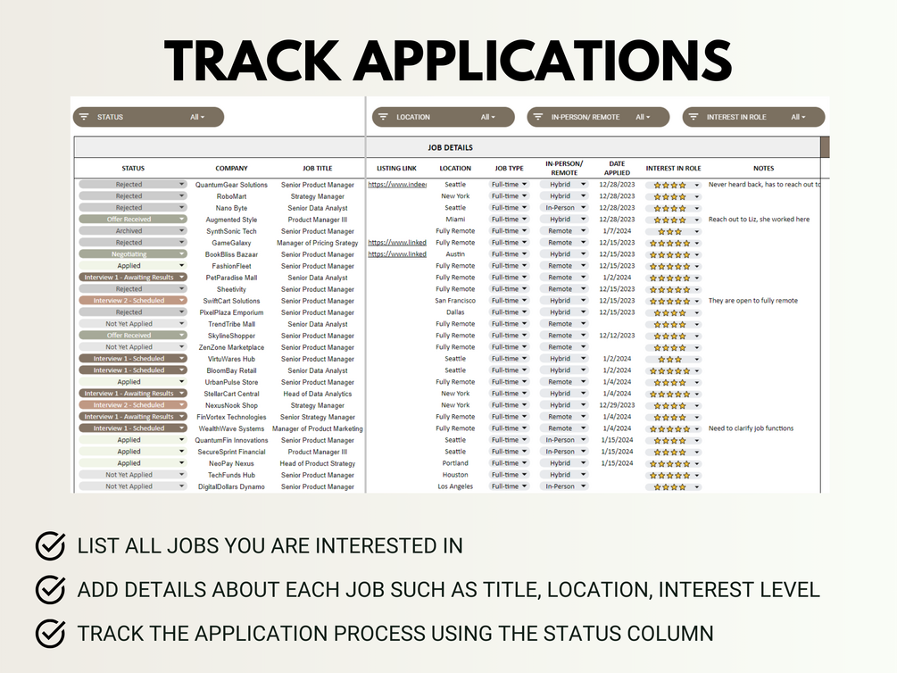Manage your job search efficiently with our comprehensive Job Application Tracker. Designed to streamline your application process, this tool helps you keep track of your job applications, interviews, and offers. Stay organized and focused on landing your dream job with ease.