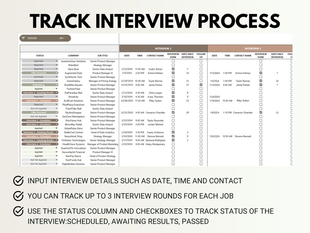 Start by setting up the tracker with our easy-to-follow instructions. Input your job applications, track interview dates, and update the status of each application. Use the dashboard to visualize your progress and the comparison tool to evaluate job offers.