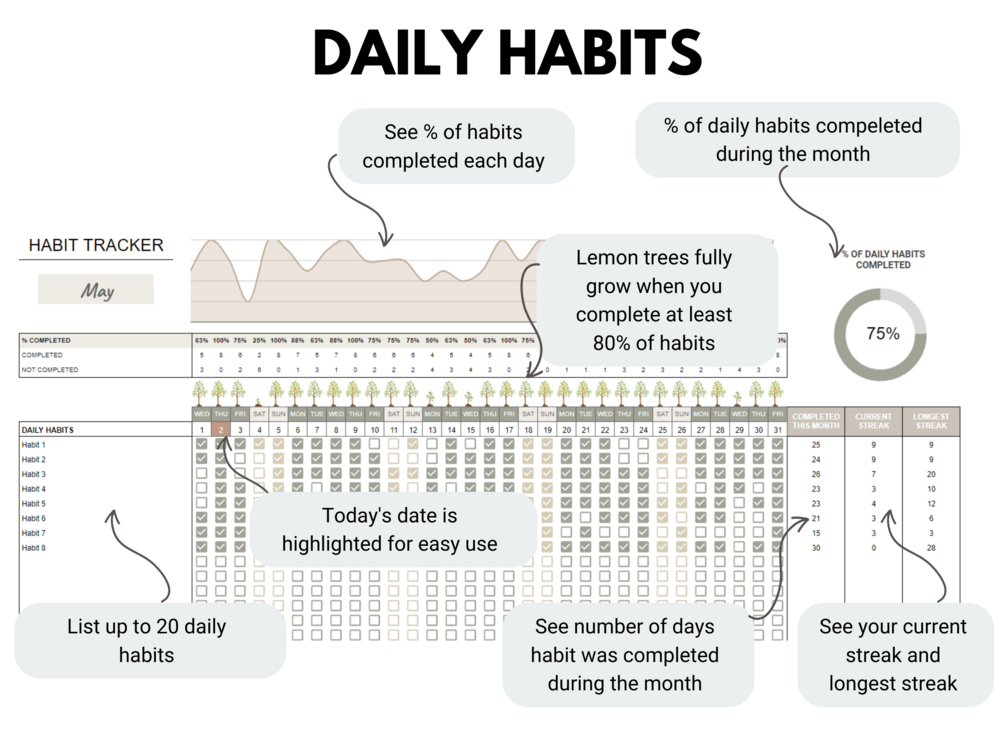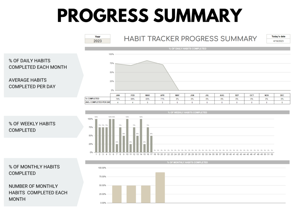 - Easy to Use Habit Tracker: Our spreadsheet is user-friendly and straightforward, making it simple to input and monitor your habits. No complicated setups or learning curves – just effective habit tracking.