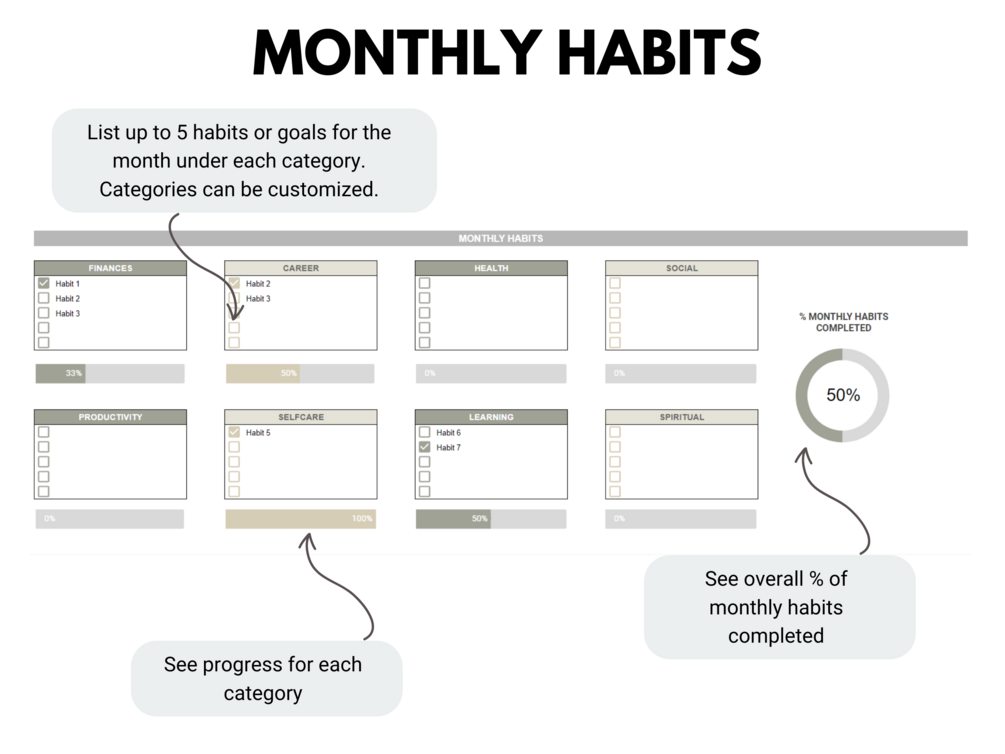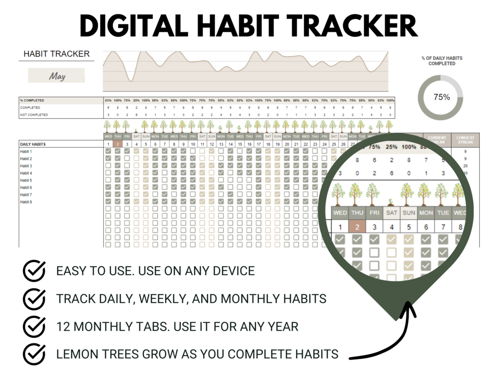 - Easy to Use Habit Tracker: Our spreadsheet is user-friendly and straightforward, making it simple to input and monitor your habits. No complicated setups or learning curves – just effective habit tracking.