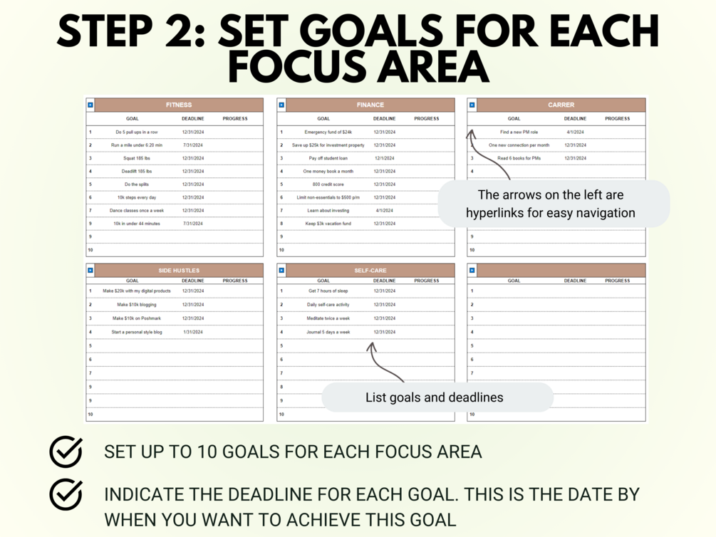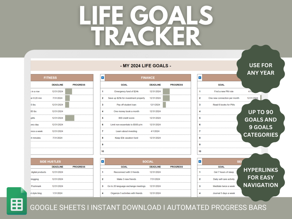 Embark on a journey of self-discovery and achievement with our Life Goals Planner and Tracker Spreadsheet. Unleash the power of organization and turn your goals into tangible accomplishments to make your dreams a reality.