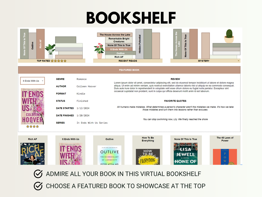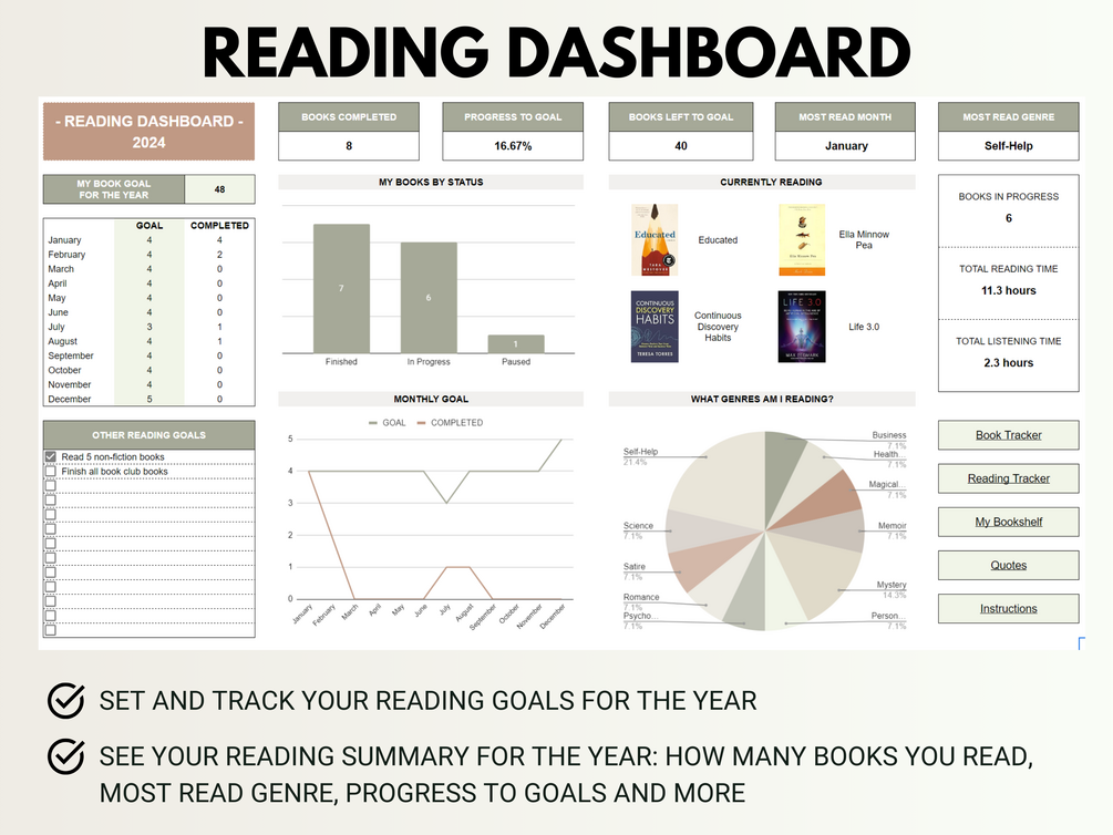 Start by inputting your current and future reads into the book tracker, logging your daily reading time in the reading tracker, and setting your yearly reading goals on the dashboard. Use the virtual bookshelf to visualize your collection, and don't forget to save your favorite quotes for inspiration!