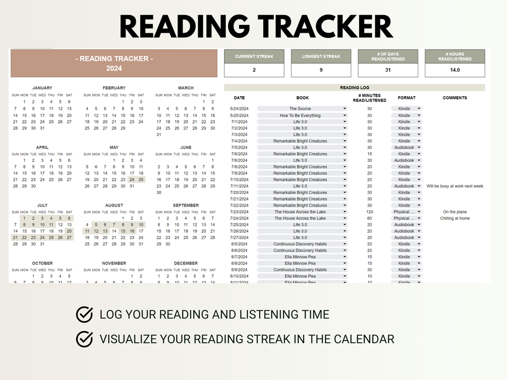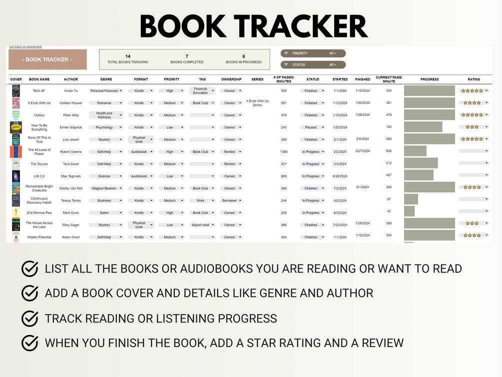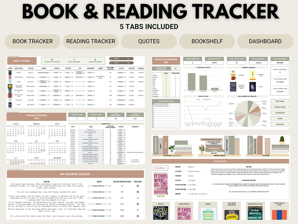 Whether you're an avid reader or just getting started, our Book and Reading Tracker is the perfect tool to organize your reading journey. This comprehensive tracker helps you manage your book collection, track your reading habits, and achieve your literary goals with ease.